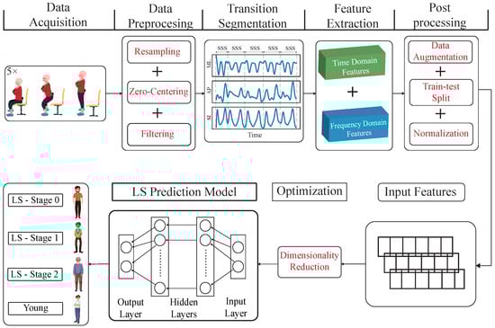 Overview of the study stages. This figure illustrates the comprehensive workflow for assessing locomotive syndrome (LS) using an instrumented five-time sit-to-stand (FTSTS) test and machine learning techniques in order to predict and identify the different stages of LS. The process begins with data acquisition, followed by data preprocessing steps, including zero-centering, filtering, and data augmentation. Sit–stand–sit (SSS) transition segmentation and postprocessing were then applied to the data. Feature extraction involved generating both time-domain and frequency-domain features, which were subsequently optimized and underwent dimensionality reduction. The data were then split into training and testing sets, then normalized before being input into the machine learning model. The model consists of an input layer, multiple hidden layers, and an output layer, which classifies the data into different stages of locomotive syndrome (LS-Stage 0, LS-Stage 1, LS-Stage 2).