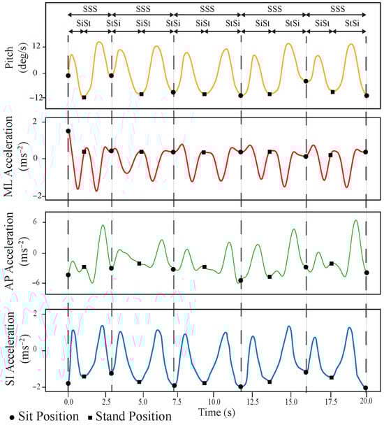 In the analysis of the FTSTS experiment, the segmentation into distinct phases such as sit–stand (SiSt), stand–sit (StSi), and sit–stand–sit (SSS) transitions is crucial for understanding the dynamics of the activity. This transition segmentation was conducted to capture the specific biomechanical and movement dynamics associated with each transition phase of the FTSTS test. Each mode represents a unique aspect of postural control, lower limb strength, and coordination, which are critical for assessing the locomotion of participants. For instance, the SiSt postural transition is widely used to evaluate lower limb function, strength, and balance in older adults [48]. The performance on Sthe iSt transition has been linked to leg extensor strength, vestibular impairments [49], and alterations in movement strategies [50]. As a result, SiSt and StSi transitions have been applied in various contexts, including the evaluation of postural control [51], fall risk [42], poststroke impairments [52], and overall disability [53]. The SSS transition combines the elements of both phases and represents the ability to perform repetitive transitions efficiently. By segmenting the data, we ensured that the nuanced characteristics of each transition were preserved, enabling a more detailed analysis of how these phases relate to different LS stages. This segmentation also facilitated the extraction of phase-specific features, which are crucial for developing accurate predictive models. This segmentation ws accomplished using change in pitch data recorded on the gyroscope of the IMU, which represents the forward and backward tilt of the IMU. To identify the transitions, we focused on detecting the local minima in the change in the pitch data, as these points correspond to critical phases in the movement [54]. By leveraging the indices associated with these local minima, we could precisely pinpoint the moments when a participant transitioned between sitting and standing, standing and sitting. The recorded trunk accelerations of a young participant along the mediolateral (ML), anterior–posterior (AP), and superior–inferior (SI) directions are presented in Figure 2. Additionally, it highlights the corresponding transitions between the SiSt, StSi, and SSS segments during the FTSTS test.