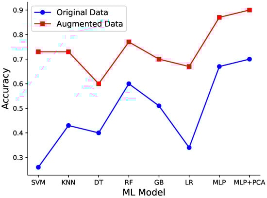 A line chart comparing the accuracy of eight different machine learning models on the original and augmented datasets. The augmentation significantly improves model performance, particularly for models like SVM, LR, and MLP.