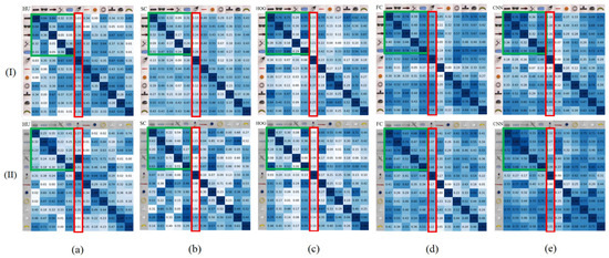 The images in the rows of Figure 4a–e list the symmetric confusion matrixes of , , , , and , where the images in the columns of Figure 4(I) and Figure 4(II) are the results for the objects selected from Cornell and Jacquard, respectively. In Figure 4, the darker grid implies greater similarity between and . We can see from Figure 4 that these symmetric confusion matrixes are similar in the distribution of the values, especially the values in the green rectangle areas. Furthermore, the values of among the first three objects seem relatively higher. In these symmetric matrixes, the general colors of , , and are relatively lighter than those of and . One possible reason is that the SC, Hu, and HOG pay more attention to the gradient features, while the FC network and CNN autoencoder obtained the objects’ shape and appearance features synchronously. In this way, the symmetric matrixes can be divided into two groups: Group A (SC, Hu, and HOG) for shape, and Group B (FC network and CNN autoencoder) for appearance.