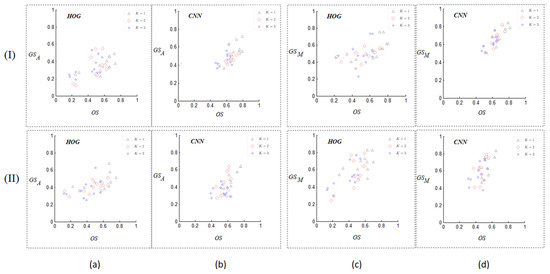 Just like the results presented in Figure 4, in Group A, the HOG represented better performance on objects similarity, which coincided more with the perspective of humanity (e.g., the OS relevance among the first, second, and the third object, and the OS differences for the 4th and the 6th object with others). Similarly, the FC and CNN methods in Group B also obtained similar reliable OS distribution to those in Figure 4, while the CNN method performed better.