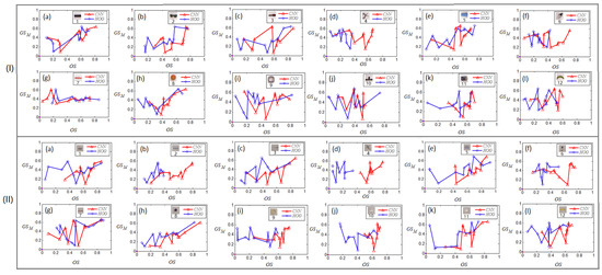 The 24 images in Figure 6 (I) and (II) list the values of in the SE-Plane between the max IoU values of the grasping positions and the objects similarity for each object given in Figure 3a,b, where the connecting line in red means that the values of objects similarity were obtained by the CNN autoencoder, and the ones in blue were from the HOG. We can see from Figure 6 that the points which have the highest values of are mostly located at the top-right areas of the SE-Plane, and the points with higher similarities in object and grasp positions are mostly located in the top-right area of the points whose object and grasp position similarities are relatively smaller, especially the points labeled by red ‘Δ’ and blue “◊” in Figure 6(I)(II)(a–c,e,h–l).