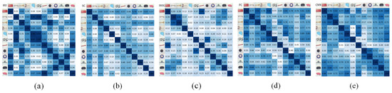 The objects similarity confusion matrixes of (a) , (b) , (c) , (d) , and (e) for the realistic objects listed in Figure 3c.