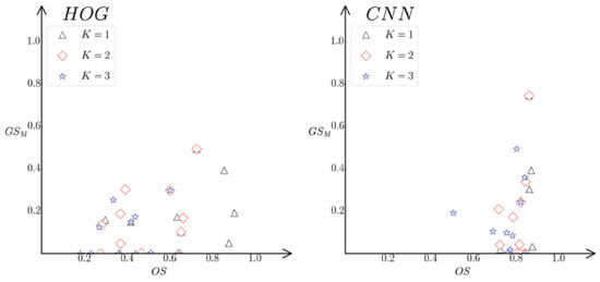 Figure 5a,b list all the top k points for the HOG and CNN autoencoder in the proposed SE-Plane, respectively, for the objects in Figure 3a,b. In Figure 5, the values of X-coordinate present the top 1, top 2, and top 3 objects similarity for , and those of Y-coordinate present the average grasping similarity between the selected top objects for . Figure 5c,d list all the top points for the HOG and CNN autoencoder.