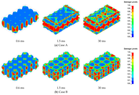 To validate the blasting efficacy under diverse charging arrangements, the damage cloud diagrams at 0.6 ms, 1.5 ms, and 30 ms post-detonation were selected for analysis, as depicted in Figure 8. These damage cloud diagrams depict the damage degree of the rock mass, where D = 1 signifies the complete damage to the surrounding rock, with severe crushing, and D = 0 indicates no damage, with the surrounding rock properties being unaffected by the blasting-induced loads. Observations indicate that the initiation of explosive detonation within each borehole is accompanied by the pronounced fragmentation of the surrounding rock mass. This is due to the reflection of stress waves at the borehole wall, where the reflected tensile stress waves cause extensive damage to the rock matrix. Over time, the cumulative impact of blasting results in the formation of a crush zone that radiates outward from the blast center. Concurrently, the rock damage around the internal blast hole exhibits radial fracturing characteristics. This is because the cylindrical symmetry of stress wave propagation is a fundamental characteristic of explosive detonation, regardless of the initiation pattern. As the stress waves emanate from the porous explosive structure, they undergo superposition and propagate spherically towards the surrounding boundaries. This spherical wavefront distribution leads to a slightly enhanced fragmentation effect along the centerline of each borehole compared to adjacent regions. Finally, the expansion of the initial radial fractures is accelerated by the influence of high-pressure explosive gasses, leading to their rapid stretching and widening. Therefore, the selection of an appropriate hole and row spacing is critical. When such conditions are met, the fissures generated by individual boreholes interconnect, forming a cohesive network. This interconnected fissure system undergoes further expansion and extension, ultimately resulting in the disintegration of the rock mass into smaller, discrete fragments.