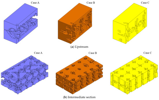 To facilitate a more detailed examination of rock fragmentation, units exhibiting damage values exceeding 0.6 post-blasting were classified as failed and were subsequently excluded from analysis. The residual rock units were monitored and are depicted in Figure 9. The rock morphology resulting from blasting with schemes A, B, and C is denoted by purple, orange, and yellow, respectively. The results demonstrate significant discrepancies in rock fracturing among the three scenarios. Case A, which featured a singular section of concentrated explosives, exhibited a pronounced superposition of stress waves. The coupled stresses exerted strong lateral impacts on the protective layers on both sides of the blasting zone, leading to substantial damage in these areas. For the two sections of the charge (Case B), the main blasting area experienced damage expansion and penetration, enabling the successful propagation of cracks. Conversely, the six-section charge (Case C) did not appear to achieve the desired blasting excavation effect, suggesting that the rock mass may not have been effectively fragmented. Notably, all three schemes exhibited extensive damage at the free surface of the intermediate section. This observation may be attributed to the incomplete absorption of stress waves, which allows reflected tensile stress waves to propagate back into the rock mass, leading to subsequent damage.