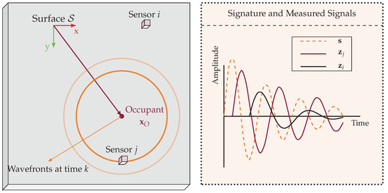 Consider a homogeneous and isotropic floor surface of a building. When an occupant O steps at a location , they induce a distinct waveform vector at that location, where K denotes the total number of discrete time samples in the waveform, with each element corresponding to the recorded signal at time step k. This waveform is referred to as the signature, and it propagates through the floor and is detected by stationary sensors placed at various positions , for .