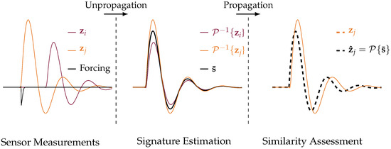This figure illustrates the process of transforming sensor measurements, and , into estimated signatures and assessing their similarity. The shorthand P denotes the propagation operator, which is used to convert sensor data into meaningful signatures. Initially, the unpropagation step transforms the measurements into estimated signatures and , producing the estimated signature . Subsequently, the similarity between the propagated signature and the original measurement is assessed, allowing for a comparison of the sensor outputs.