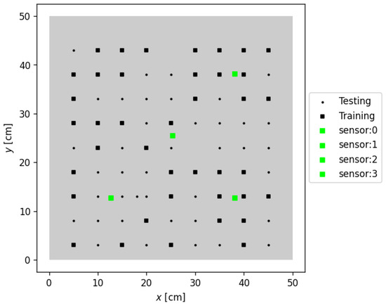 A 15 kg plate made of 6061 aluminum alloy with dimensions 50 × 50 × 2 cm was tested using the baseline approach [18]. Four Piezometric PCB 333B50 sensors (PCB Piezotronics, Depew, NY, USA) were attached to the plate. The plate was secured at the four corners with 0.40 cm diameter screws, preventing both displacement and rotation. A PCB 086C03, (PCB Piezotronics, Depew, NY, USA), impact hammer struck the plate at eighty-one different locations, spaced 5 cm apart, covering the entire plate area. An instrumented hammer was used to excite the plate, thereby inducing vibrations. Each location was struck once, and force and acceleration data were recorded at a sampling rate of 2048 Hz for 20 s. The experimental data collected from the aluminum plate were divided into two groups. Following the original study, forty out of eighty-one impacts were used to calibrate our model, and the remaining forty-one impacts were used to validate the vibro-localization technique. Figure 3 demonstrates the layout of the sensors and the impact locations on the plate. The training () and testing points () were marked with squares (■) and filled circles (●), respectively. The sensor locations were marked with green squares (■).