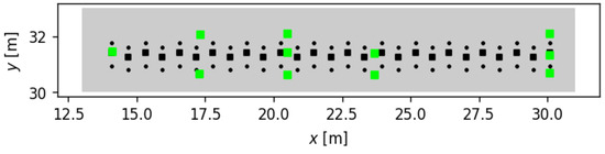 The building-scale experimental dataset used in this study was first introduced in [22] and later used in [23,24]. The dataset was collected in the Goodwin Hall at Virginia Tech, a five-story building with a steel frame and concrete floors. This dataset involves participants walking along a predefined path (step length and width were set to 62 and 15 cm) in a corridor, with sensors placed at various locations to capture the vibrations. In these experiments, two participants walked along a predefined 16 m path, separately. Figure 4 shows the step locations—represented by black squares (■) and circles (●), respectively, for training and testing cases—and the sensor locations—represented by green squares (■)—superimposed on the path. We based our reference point on these studies and used the same experimental data as in [24]; thus, it will be referred to as the benchmark in the context of building-scale experiments.