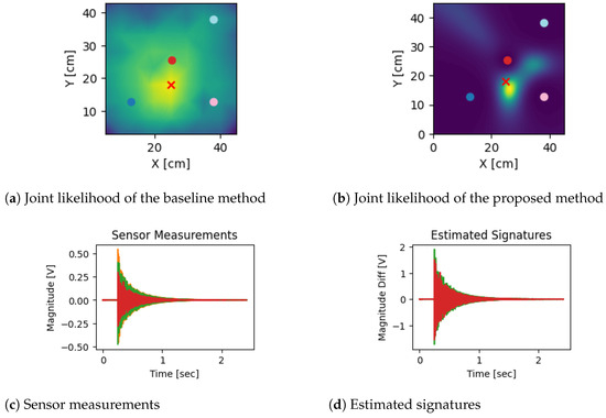 This figure presents a comparison of the joint likelihoods and sensor data for an impact location near the sensor array. The top left subfigure shows the joint likelihood computed using the baseline [18] method, while the top right subfigure displays the joint likelihood obtained from the proposed technique. The bottom left subfigure illustrates the raw sensor measurements, and the bottom right subfigure shows the estimated signatures derived from these measurements. This comparison highlights the performance of both methods in accurately estimating the impact location based on vibrational data.