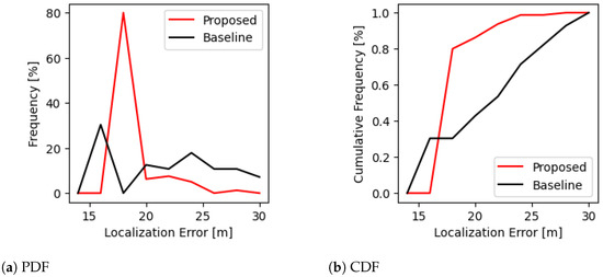 PDF and CDF of localization error for the proposed method and the baseline approach. In the PDF (left), the proposed method exhibits a sharp peak around 20 m, indicating a higher frequency of lower localization errors compared to the baseline, which shows a more distributed error profile. The CDF (right) further supports this observation, as the proposed method achieves 80% cumulative frequency at a lower error range than the baseline, demonstrating a more consistent and accurate performance. These results suggest that the proposed technique significantly reduces localization error, achieving more reliable estimates than the baseline method.