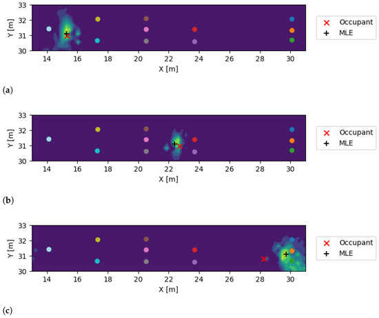 Figure 7 illustrates three representative results observed in the building dataset. The figure shows the joint likelihood of the proposed technique as well as the estimated impact locations. In an ideal scenario, the joint likelihood function should have a single peak at the true impact location with minimal uncertainty. Figure 7a–c demonstrate a scenario where an occupant is walking along the corridor, and the sensors are placed at different locations to capture the vibrations. Figure 7a demonstrates the scenario where the occupant is located at the leftmost end of the corridor, while Figure 7b shows the scenario where the occupant is located at the center of the corridor. Finally, Figure 7c illustrates the scenario where the occupant is located at the rightmost end of the corridor. The results demonstrate that the proposed technique accurately estimated the impact locations for both occupants.