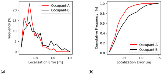 Table 3 presents descriptive statistics of localization error for Occupant A and Occupant B using three error estimates considering the outliers in the data: raw, Winsorized at 1 m, and rank-based methods. For the raw data, Occupant A shows a mean localization error of 0.35 m with a standard deviation of 0.21 m, while Occupant B exhibits higher error values, with a mean of 0.62 m and a larger standard deviation of 1.06 m. After Winsorizing at 1 m, Occupant A’s mean error slightly decreases to 0.34 m with a reduction in standard deviation to 0.2 m, and Occupant B’s mean error decreases to 0.48 m with a reduction in standard deviation to 0.29 m. This suggests that extreme values had more influence on Occupant B in the raw data. The rank-based method, which uses median and MAD, provides a more robust central tendency, with Occupant A showing a median error of 0.31 m and an MAD of 0.12 m, while Occupant B has a median of 0.4 m with an MAD of 0.19 m. Additionally, the 95% confidence interval for the mean localization error is (0.31, 0.38) m for Occupant A and (0.44, 0.80) m for Occupant B, indicating that Occupant B consistently shows higher localization error estimates across all metrics, although variability is reduced when outliers are controlled.
