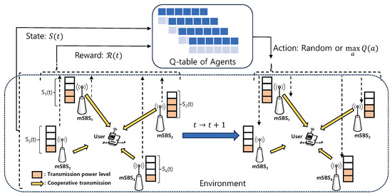 The power control strategy of cooperative transmission can be modeled as a Markov decision process (MDP) and solved using an RL approach [21,24]. Note that in our system, each mSBS selects an action based on the current state, and the environment then transitions to the next state. The next state only depends on the action and the current state and is not related to previous states and actions. In our system, a centralized RL algorithm requires a central controller with complete information about multiple mSBSs, which leads to increased algorithmic complexity as the number of cooperative mSBSs grows. Extra connections between the central controller and the mSBSs are required to collect information on the BSs. To overcome these limitations of the centralized approach, we propose a multi-agent distributed QL approach to individually control the transmission power of the cooperative mSBSs.