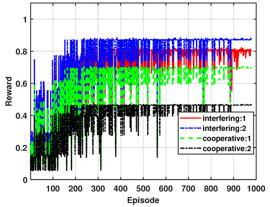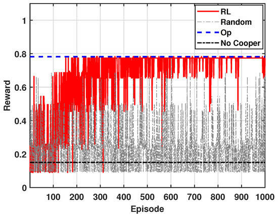 Figure 4 shows the accumulated reward of mSBSs for = 0.95. Similar to Figure 3, the results are obtained over 1000 episodes. In Figure 4, because the value is higher, more weight is given to outage, thus reflecting its increased importance in the reward calculation. As a result, the accumulated reward in Figure 4 is relatively higher than that in Figure 3. This is because a higher value emphasizes the more significant reduction of outage, ultimately leading to a higher overall reward. The overall trend in Figure 4 remains consistent with that presented in Figure 3.