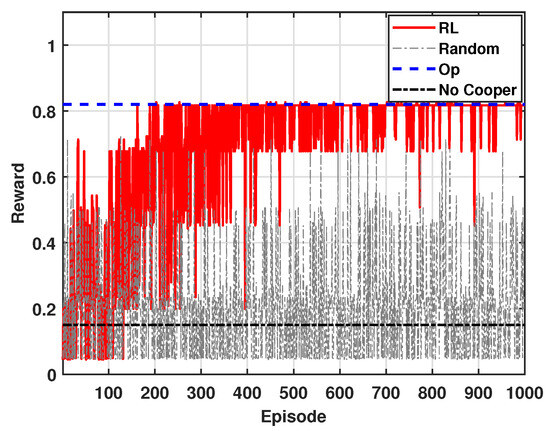 For the performance evaluation of the proposed system, we build a simulation program using MATLAB R2020a. In the network topology, the number of mSBSs that can conduct cooperative transmission is set to 4, and the number of interfering mSBSs is set to 15. The distance between the user and the mSBSs conducting cooperative transmission, , is 200 m, while the distance between the user and the interfering mSBSs, , is 500 m, as shown in Figure 2. In this model, we consider the rectangle model for the blockage effect model as [25]. For the channel model, we consider that each mSBS has an independent and identically distributed Nakagami fading channel and m = 3. Moreover, = 2, = −174 dBm/Hz + 10log10( + 10 dB), = 1 GHz, and = −1. For the hyperparameters, = 0.1, = 0.95, = 0.99, and = 50. The parameters chosen in our framework are listed in Table 1. Our system is also compared with the following three schemes: (1) Random Action (): mSBS randomly chooses an action in each iteration. (2) Reward-Optimal (): The optimal solution can be obtained by the exhaustive search algorithm, where all possible states are considered. (3) No cooperative transmission scheme (): mSBSs do not conduct cooperative transmission.