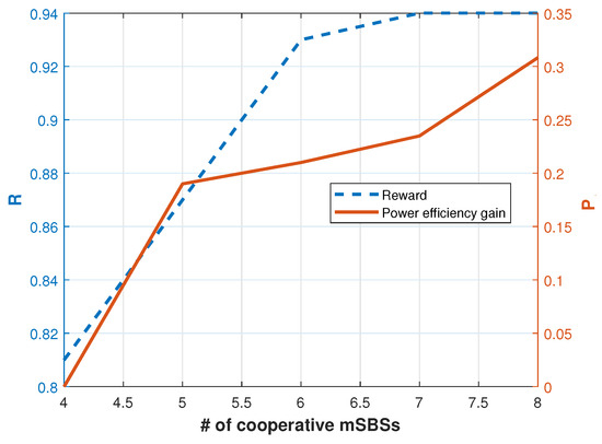 Figure 5 shows the relationship between the number of cooperative mSBSs and two key performance metrics: reward (R) and power efficiency gain (). As the number of cooperative mSBSs increases, there is a notable trend where decreased power is required for transmission due to enhanced cooperation among the mSBSs. Simultaneously, the energy efficiency of the system improves as the number of cooperative mSBSs increases. The increase in energy efficiency is a direct result of the reduced power consumption, which is achieved through cooperative behavior among the mSBSs. This trend demonstrates that by increasing the number of cooperative mSBSs, it is possible to achieve significant improvements in energy efficiency while maintaining or even enhancing the overall system reward.
