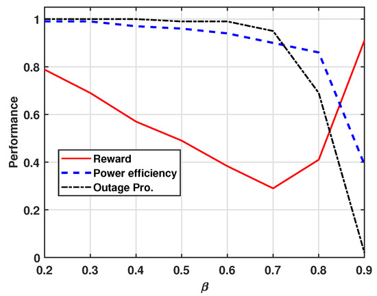 Figure 6 represents the effect of in the reward function. As increases, the reward function places greater weight on the outage probability, while a decrease in emphasizes the energy efficiency. When approaches 0, the reward is determined mainly by energy efficiency, which is ideal for minimizing power consumption. As approaches 1, the reward is more influenced by the outage probability, making it more suitable for scenarios where the service reliability is prioritized. For instance, when , the reward reaches its lowest value, reflecting the greater impact of outage probability. As increases up to 0.7, all values decrease, focusing on the outage probability. However, after this point, the reward begins to increase while the outage probability drops sharply. At , the reward function shows a balanced trade-off between the outage probability and energy efficiency, resulting in a moderate reward.