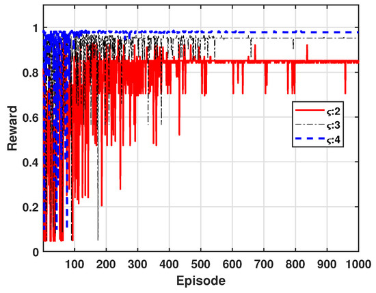 Figure 7 shows the variation in reward values as the path loss exponent is adjusted to values of 2, 3, and 4, where the path loss exponent determines the rate of signal attenuation over distance. For example, higher exponent values result in faster signal decay, which can lead to improved SINR due to reduced interference. In our approach, power control is applied to maximize reward by optimizing SINR, thereby reducing outage probability and enhancing energy efficiency. From this figure, we can see that higher path loss exponent values lead to fewer episodes required for learning convergence and ultimately yield higher reward values.