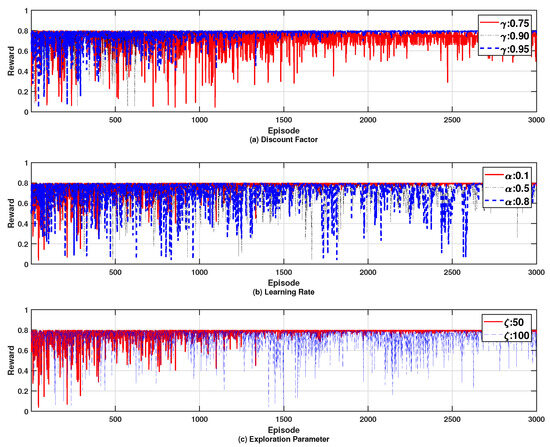 Effects of varying key RL parameters on the reward; (a) discount factor, (b) learning rate, and (c) exploration parameter.