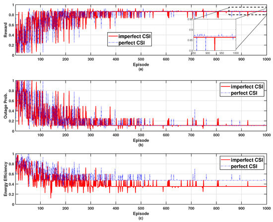 Effects of channel state information on the performance; (a) reward, (b) outage probability, and (c) energy efficiency.