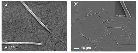 Figure 2b shows the SEM image of the ZnO-SiO2 composite film annealed at 500 °C, with the inset showing a magnified view of an individual ZnO nanorod. Compared to the sample annealed at 300 °C, the film annealed at 500 °C exhibits a larger number of ZnO nanorods, which are also significantly longer, ranging from 10 μm to 30 μm in length. It is suggested that the higher annealing temperature significantly enhances the growth rate of the ZnO nanorods, facilitating them to reach the surface of the SiO2 substrates more rapidly.
