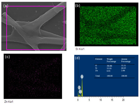 EDS mapping of ZnO-SiO2 films annealed at 500 °C: (a) the selected area; (b) Si elemental mapping; (c) Zn elemental mapping; (d) EDS spectrum.