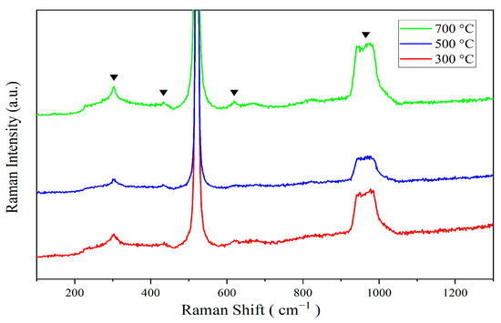 Raman patterns of annealed at 300 °C, 500 °C, and 700 °C.