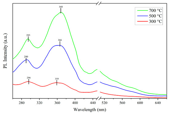 PL spectra of ZnO-SiO2 films annealed at 300 °C, 500 °C, and 700 °C.
