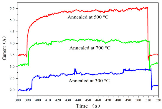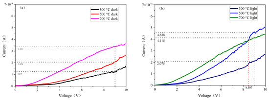 As shown in Figure 6b, under visible light illumination, the conductivity of the prepared films increases significantly, particularly for the film annealed at 500 °C. At the voltage of about 8.5 V, the photocurrent of this sample surpasses that of the film annealed at 700 °C.