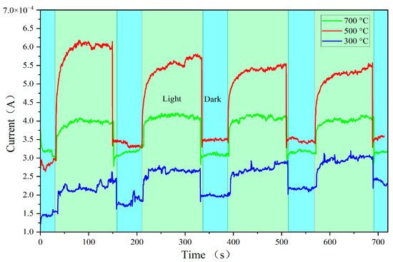 Table 1 presents the current values of the films under various light conditions at a voltage of 9 V. The data in the table show that with the visible light condition, the photocurrents of the films annealed at 300 °C, 500 °C, and 700 °C increase by 70.64%, 126.86%, and 21.35%, respectively, compared to those in darkness. This indicates that the film annealed at 500 °C exhibits superior photoconductivity related to films annealed at other temperatures.