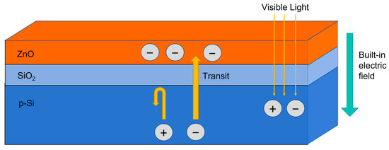 A schematic diagram of carrier transport in the ZnO-SiO2 thin film on a Si substrate under visible light illumination.