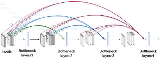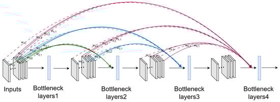 DenseNet encourages extensive feature reuse, allowing subsequent convolutional layers to utilize features extracted by earlier layers. However, as the network depth increases, this can lead to significant information redundancy. To mitigate this and enhance feature selection (as depicted in Figure 2), we incorporated a custom direct weighting module into the original DenseNet architecture. This module assigns a learnable weight coefficient to each input feature channel, enabling the model to dynamically adjust the contribution of each channel’s features according to the specific needs of the task. The model can opt to utilize all, part, or none of a given channel’s features. For instance, as inputs are passed into layer 1, the weighting module dynamically assigns a weight to each feature channel, allowing the model to control the contribution of each channel based on its relevance. Through this flexible weighting mechanism, the model effectively reduces redundant information and expands its feature search space, thereby improving overall performance and efficiency.