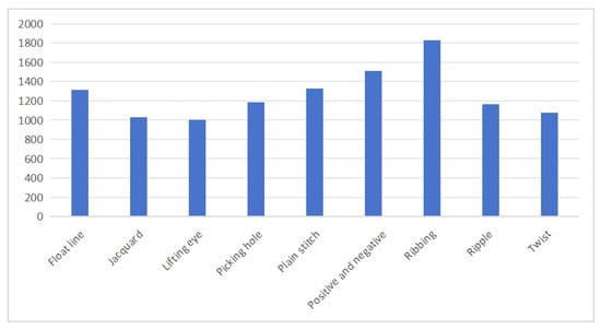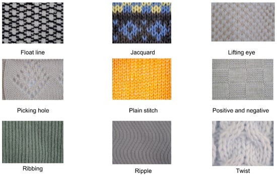 Following data augmentation, the KF9 knitted fabric dataset contains 13,259 samples distributed across nine categories: float line, jacquard, lifting eye, picking hole, plain stitch, positive and negative, ribbing, ripple, and twist patterns. Each category corresponds to a distinct, commonly used knitted fabric texture, as illustrated in Figure 6, with representative images provided in Figure 7. On average, each category contains slightly over 1000 samples, though the distribution varies. The ribbing category has the largest representation with 1828 images, while the drop stitch category contains the fewest, with 1003 images. All images were captured at a resolution of 1560 pixels wide by 1040 pixels high, yielding an aspect ratio of approximately 1.5:1, ensuring sufficient detail for accurate analysis of the fabric structures.