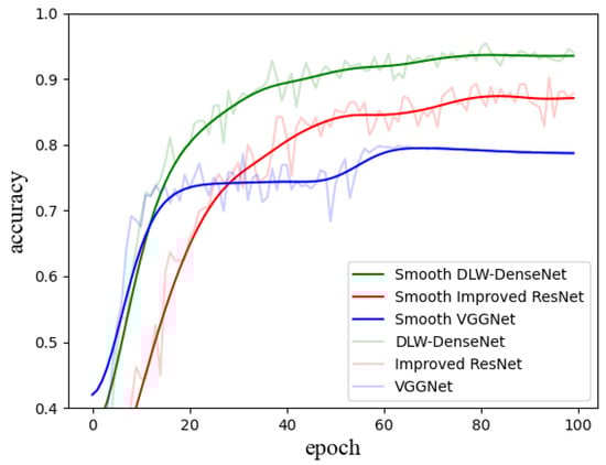 The comparison of performance among the improved ResNet, VGGNet-16, and our proposed network. The horizontal axis represents the number of iterations, while the vertical axis denotes classification accuracy. The solid line represents the smoothed data, whereas the dashed line corresponds to the original data.