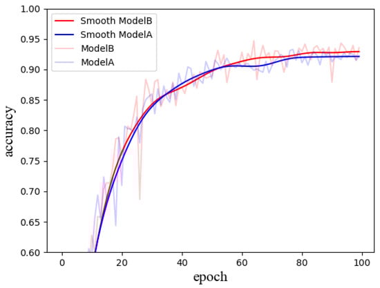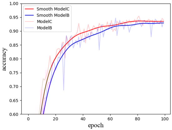 In Figure 10, the differential learning strategy applied in Model C further enhances performance. After 100 epochs, Model C attains an accuracy of 95.4%, which is 0.7 percentage points higher than that of Model B. Additionally, the results indicate that Model C not only surpasses Model B in terms of accuracy but also exhibits faster convergence and greater stability throughout the training process.