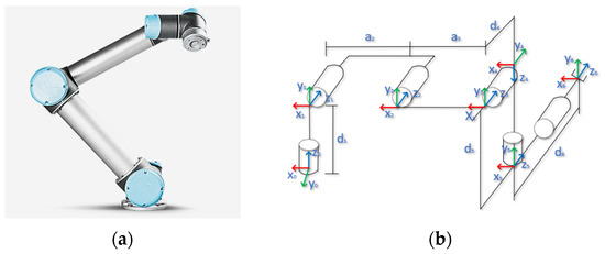 UR5 robotic arm. (a) Robotic arm physical model; (b) robotic arm D-H model.