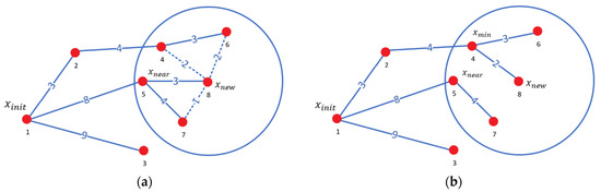 RRT* algorithm rewires the random tree process. (a) Rewire the random tree process; (b) rewiring the random tree result. The red dots indicate path nodes.