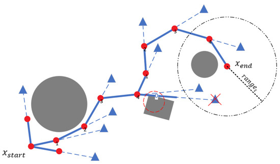 Random point sampling process. The red dots indicate path nodes, triangles indicate random sampling points, red circles denote collisions, and ‘X’ marks indicate discarded sampling points.
