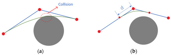 where is the characteristic point of the control curve, and is the k-th order B-spline basis function. Directly smoothing the paths after removing redundant nodes may lead to path collisions with obstacles (as shown in Figure 7a). To prevent this, additional path points are inserted near each turning point before the smoothing process. These points are placed both before and after the turning points, with a distance d between them (as shown in Figure 7b). By dynamically adjusting the value of d, the path can be adaptively adjusted based on the length and complexity of the turns: for longer or smoother segments, a larger d is used to enhance smoothing efficiency; for shorter or more frequent turns, a smaller d is selected to keep the path close to the original trajectory and reduce the risk of collision. This setup effectively minimizes the likelihood of path deviation and ensures that the smoothed path closely follows the original trajectory.