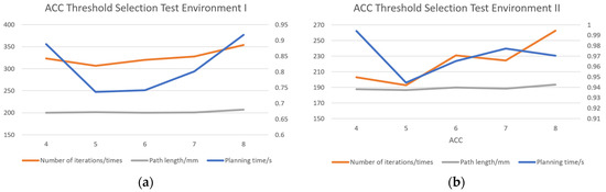 In Test Environment I, the shortest planning time (0.74 s), the fewest number of iterations (306.49), and a reasonable path length (201.13 mm) were achieved with an ACC threshold of 5. In Test Environment II, an ACC threshold of 5 also yielded the best results, with a planning time of 0.94 s, 192.84 iterations, and the shortest path length (186.45 mm). The line graphs clearly demonstrate the superior overall performance at an ACC threshold of 5. Therefore, an ACC threshold of 5 is selected as the optimal value in this experiment. This threshold not only accelerates the path search process but also enhances the efficiency and accuracy of the algorithm, particularly in complex environments such as dense, obstacle-rich, and unstructured tea plantation environments.