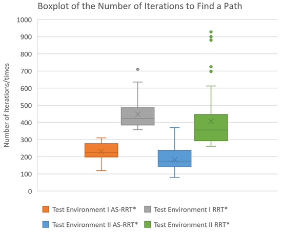 In Test Environment I and Test Environment II, the box-and-whisker plots demonstrate that the AS-RRT* algorithm significantly reduces the number of iterations compared to the RRT* algorithm, with a more concentrated distribution. This suggests that the improved algorithm not only reduces the number of iterations during the path search process but also exhibits more stable convergence. Specifically, the narrower spacing between the upper and lower quartiles in the AS-RRT* boxplot indicates a more compact data distribution with no outliers, reflecting the algorithm’s stable and reliable convergence in complex obstacle environments. In contrast, the RRT* algorithm’s boxplot shows a broader distribution range and potential outliers, indicating less stable convergence compared to the AS-RRT* algorithm.