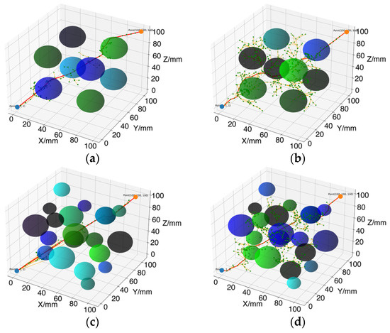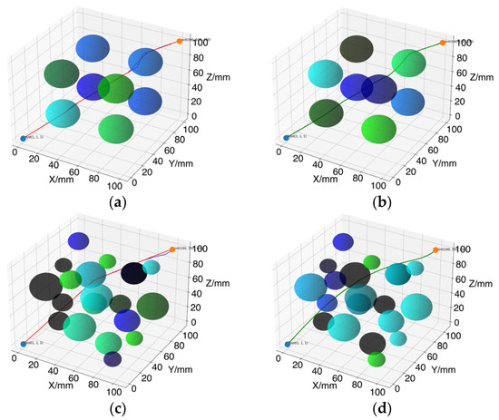 To evaluate the performance of the improved AS-RRT* algorithm, experiments were conducted in a Python 3.8 environment. The experimental setup was based on a Windows 10 operating system, with hardware specifications including an Intel(R) Core(TM) i7-9750H CPU running at 2.60 GHz and 16 GB of RAM. Two distinct 3D simulation environments were designed for the experiments, with a map size of 100 mm × 100 mm × 100 mm. The start point was set at (1, 1, 1) and the end point at (100, 100, 100), with obstacles represented as spheres.