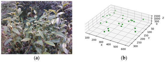 Distribution of tea buds in the picking area: (a) images captured by depth camera sensor; (b) 3D distribution of tea bud-picking points.