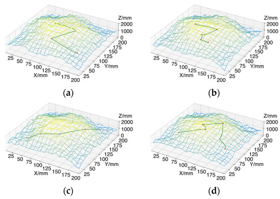 To enhance the efficiency of path planning, an enclosing box and a center point are first generated for each picking point using the nearest-neighbor algorithm. Independent path planning is then conducted for each enclosing box. This method decomposes the environment into smaller regions, making path planning more targeted, reducing collision risks, and improving the robotic arm’s real-time responsiveness for tea picking. Additionally, this approach alleviates the computational burden while ensuring that the robotic arm effectively navigates obstacles in complex environments, thereby enhancing operational safety and flexibility. In the path search process for each enclosing box, four different tea plantation environments, each measuring 200 mm × 200 mm × 2000 mm, are established. To ensure real-time picking capabilities, the maximum number of iterations is set to 1000, and the initial step size is configured to 20 mm based on the coordinate range of the picking points. Each experimental group is repeated 100 times, and the final path planning results are derived by averaging the outcomes. In Figure 13, the red points represent the tea-picking locations, the green lines illustrate the path planning results, and the blue grid displays three-dimensional information about the tea plantation environment.