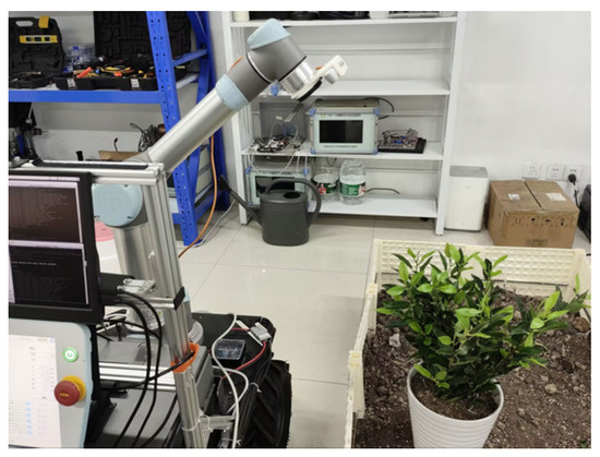 To evaluate the performance of the AS-RRT* algorithm in complex picking scenarios, a simulated picking environment was constructed in the laboratory, as shown in Figure 8. The design of the simulated tea leaves carefully considered the requirements of actual tea-picking tasks to replicate the characteristics of picking points and the flexible structure of tea leaves. The experimental setup consisted of a UR5 robotic arm (load capacity: 5 kg, repeat positioning accuracy: ±0.03 mm, maximum arm span: 850 mm) and an Intel RealSense D435i depth vision sensor. The depth vision sensor was mounted at the end of the robotic arm to capture positional information on the target tea leaves (as depicted in Figure 14). The initial configuration of the robotic arm is set to (0°, −90°, −50°, −90°, −90°, 0°). This configuration is designed to enable the robotic arm’s end-effector to quickly reach the picking point while ensuring that the depth vision sensor at the end can effectively capture the tea plantation environment information. By positioning the arm in a diagonal downward direction, the motion flexibility is maximized, thereby ensuring an efficient picking process.