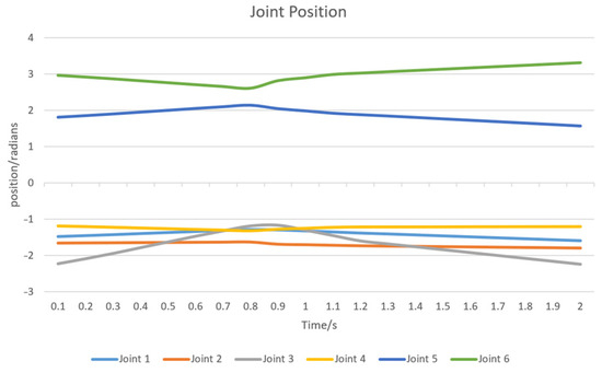 In addition, to further analyze the movement of each joint during the robotic arm’s motion, a graph depicting the changes in joint positions over time was plotted (as shown in Figure 16). The graph illustrates the trajectories of the six joints of the robotic arm throughout the path planning process. From the figure, it can be observed that joints 3, 5, and 6 exhibit significant position changes, indicating that these joints play a crucial role in the overall movement of the robotic arm. Joint 3 is primarily responsible for adjusting the mid-range posture of the arm to ensure a smooth path, while joints 5 and 6 are more involved in fine-tuning the attitude of the end-effector. The smoothness of the curves further highlights the stability and controllability of the AS-RRT* algorithm in guiding the robotic arm’s motion.