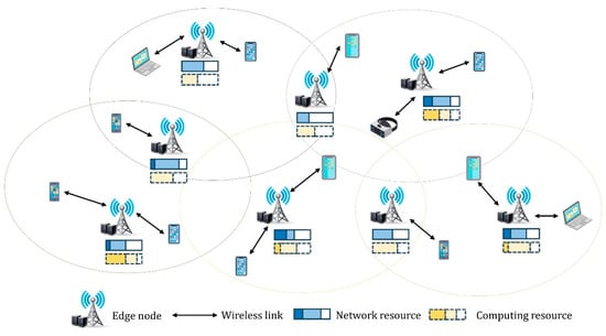 The MEC network provides logical access to all network-based SDUs. Each network has a set of BSs and a corresponding set of associated ENs. Each BS has a certain amount of network bandwidth, and each EN provides a certain amount of computing resources. The network resources comprise the bandwidth and computing resources of all BSs and ENs. Users generate W computing jobs with different service-delay requirements, which are typically offloaded to the nearest EN based on the location of the user. Each computing task can be offloaded to only one EN, and all ENs in the network exchange information to ensure optimal resource allocation.