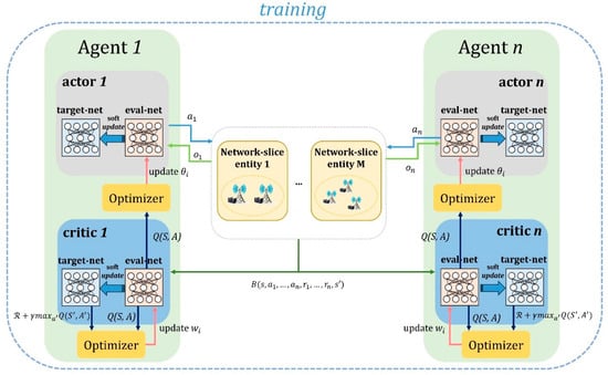 MADDPG is a multiagent RL algorithm that aims to learn the policy () and Q-function () of each agent. The algorithm employs centralized training and decentralized execution, wherein a central controller trains an agent-network group based on global environmental information, whereas the agents select and execute actions based on local environmental information [29,30]. Decentralized execution mitigates the problem of the joint-action space growing exponentially as the number of agents increases; therefore, traditional single-agent RL algorithms are unsuitable for this task.